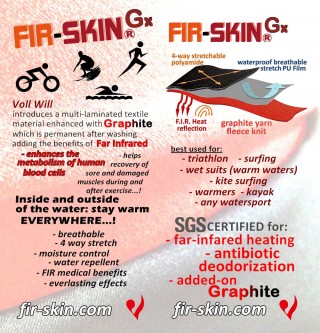 A revolutionary multilayered textile combining Graphite-infused FIR technology with high-stretch polyamide。Featuring a breathable water-repellent PU film, FIR-SKIN® GX offers the warmth of neoprene with significantly increased freedom of movement and reduced buoyancy for elite water sports.